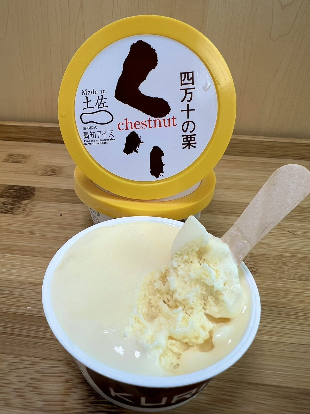 2. Thành phần : Sữa(10.7%) (sữa tươi (sản xuất trong nước)), đường, sản phẩm sữa(6.2%), lòng đỏ trứng ngâm đường (1.1%) (lòng đỏ trứng, đường), hạt dẻ (sản xuất ở tỉnh Kochi)/ chất nhũ hóa, chất ổn định (chất làm đặc polysacarit), hương liệu, (một phần chứa thành phần sữa, trứng)